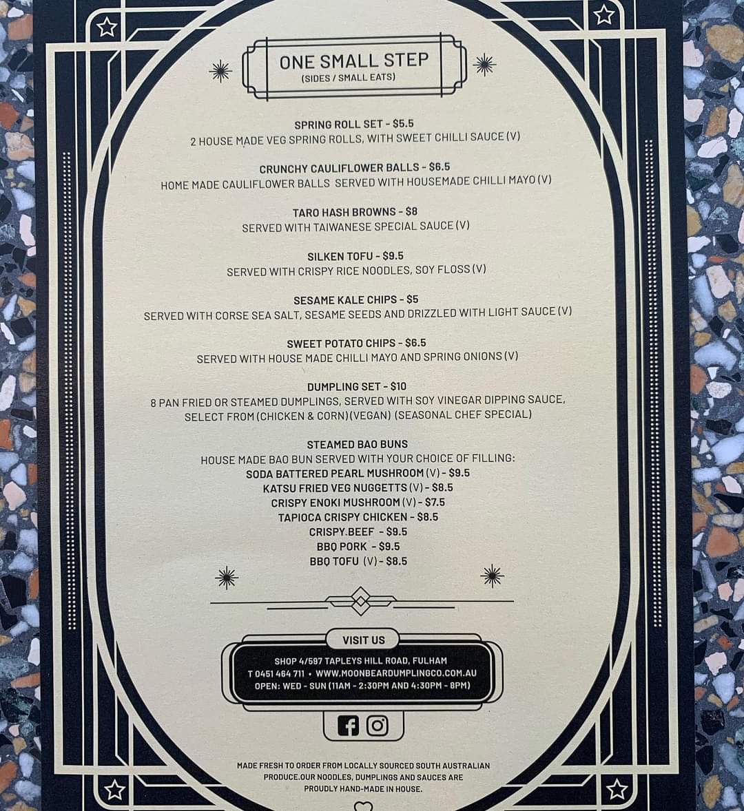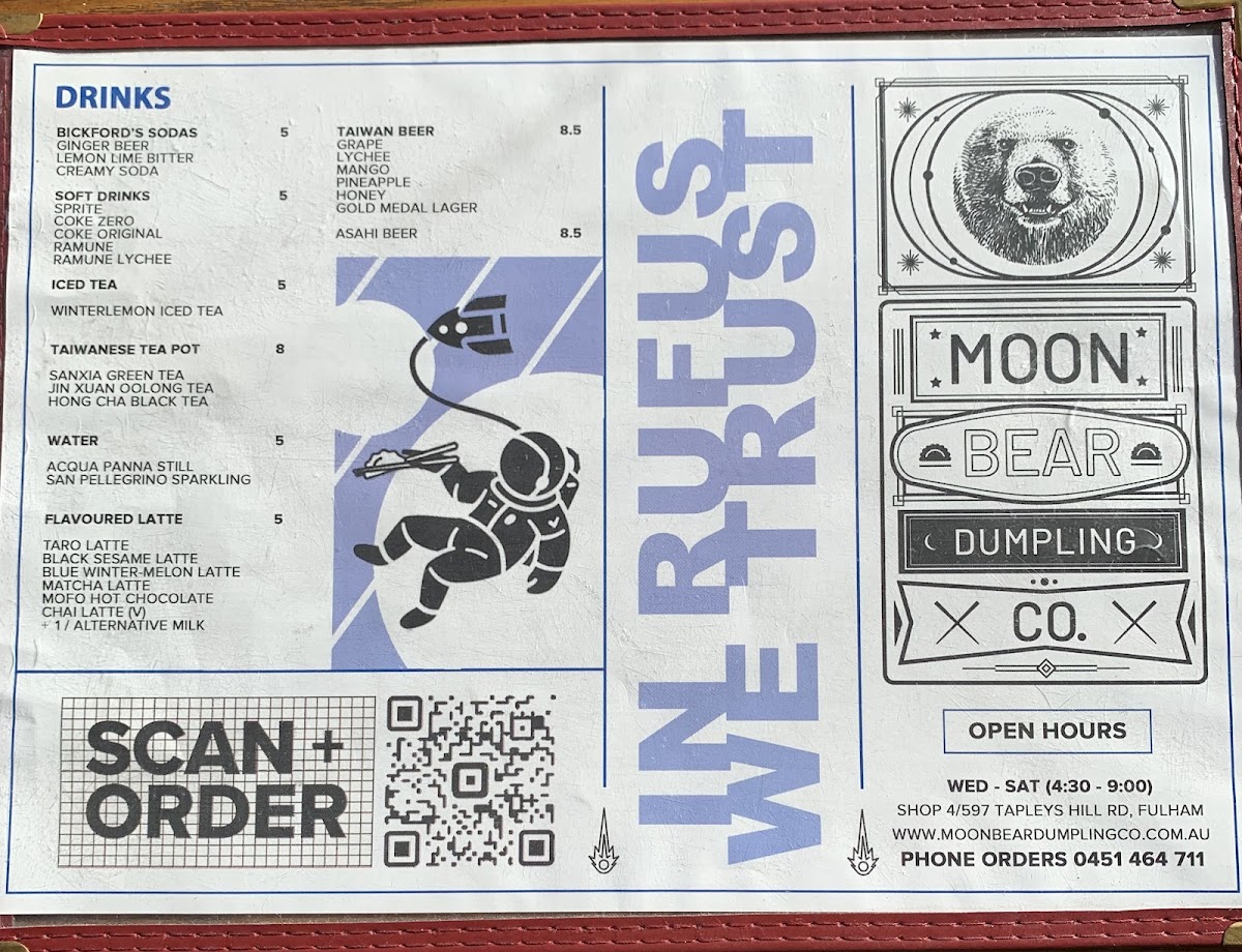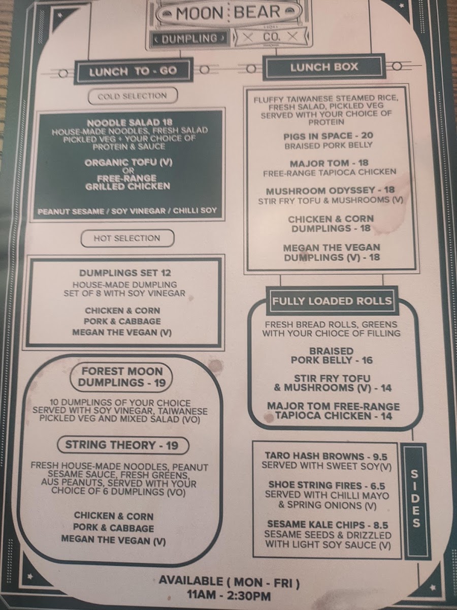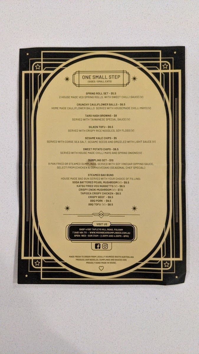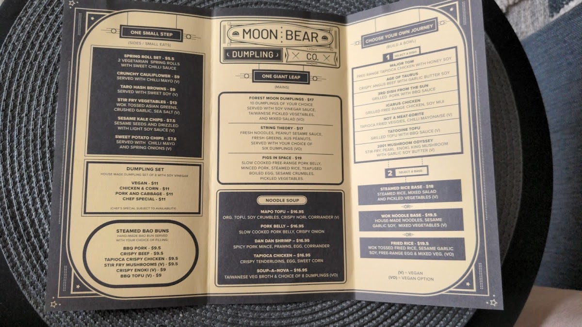 Welcome to Moon Bear Dumpling Co, an inviting gem nestled at 597 Tapleys Hill Rd, Fulham. Renowned for its delightful dumpling offerings, the menu features savory Chicken & Corn and Pork & Cabbage dumplings, each priced at A$15. For vegan enthusiasts, the Megan The Vegan is a must-try.